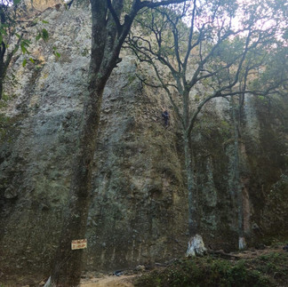 Ahí se montaron dos rutas para escalar en yoyo. La ruta de la izquierda la empezó a puntear Gustavo Navarrete (compadre de Luis), pero la terminó de armar Manolo. La ruta de la izquierda la iba a empezar a puntear Andy pero el inicio tiene un hueco y eso complicaba llegar al primer anclaje, entonces lo intentó Matías (hijo de Sandy y Marcos), yo los estaba asegurando, se me ocurrió preguntarles si podía intentar llegar al primer y segundo anclaje (yo nunca había punteado una ruta), me dijeron que sí, y pues llegué al segundo anclaje, ya no quería subir pero Bere me dijo que descansara y luego siguiera, así lo hice hasta llegar a donde debía quedar la reunión, que se armaría con 2 cintas express, las coloqué y ya que me dieron visto bueno bajé. Manolo dice que esa pared tiene unos 17 metros de altura aproximadamente. Me sorprendí de mi misma porque nunca había punteado una ruta. Debo decir también que estrené cuerda punteando esta ruta.