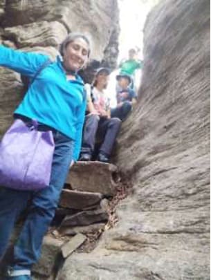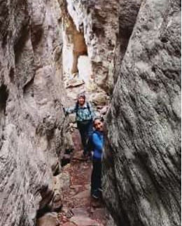 Aquí están Lety y David a punto de bajar hacia la barranca. Ahora los vemos arriba, algunos ya terminamos de bajar y estamos frente a la pared donde están las pinturas rupestres.